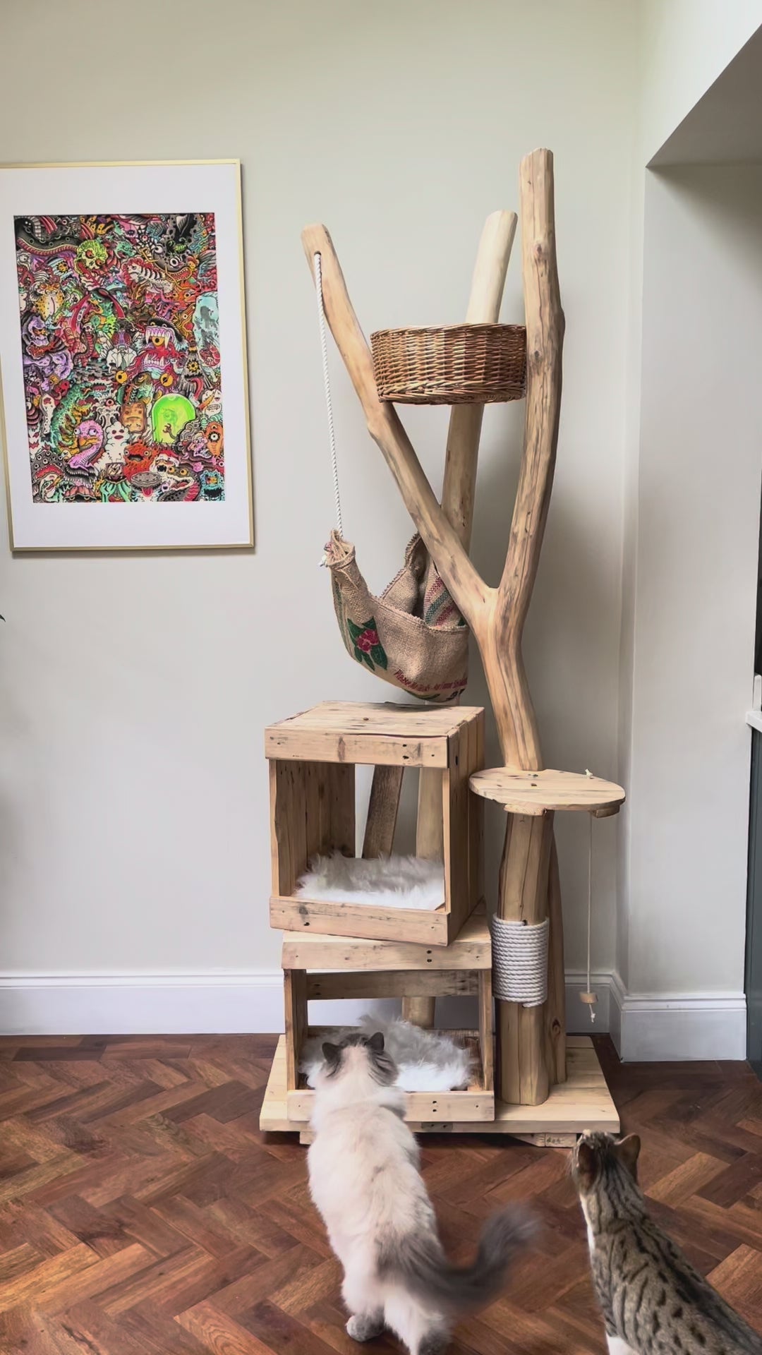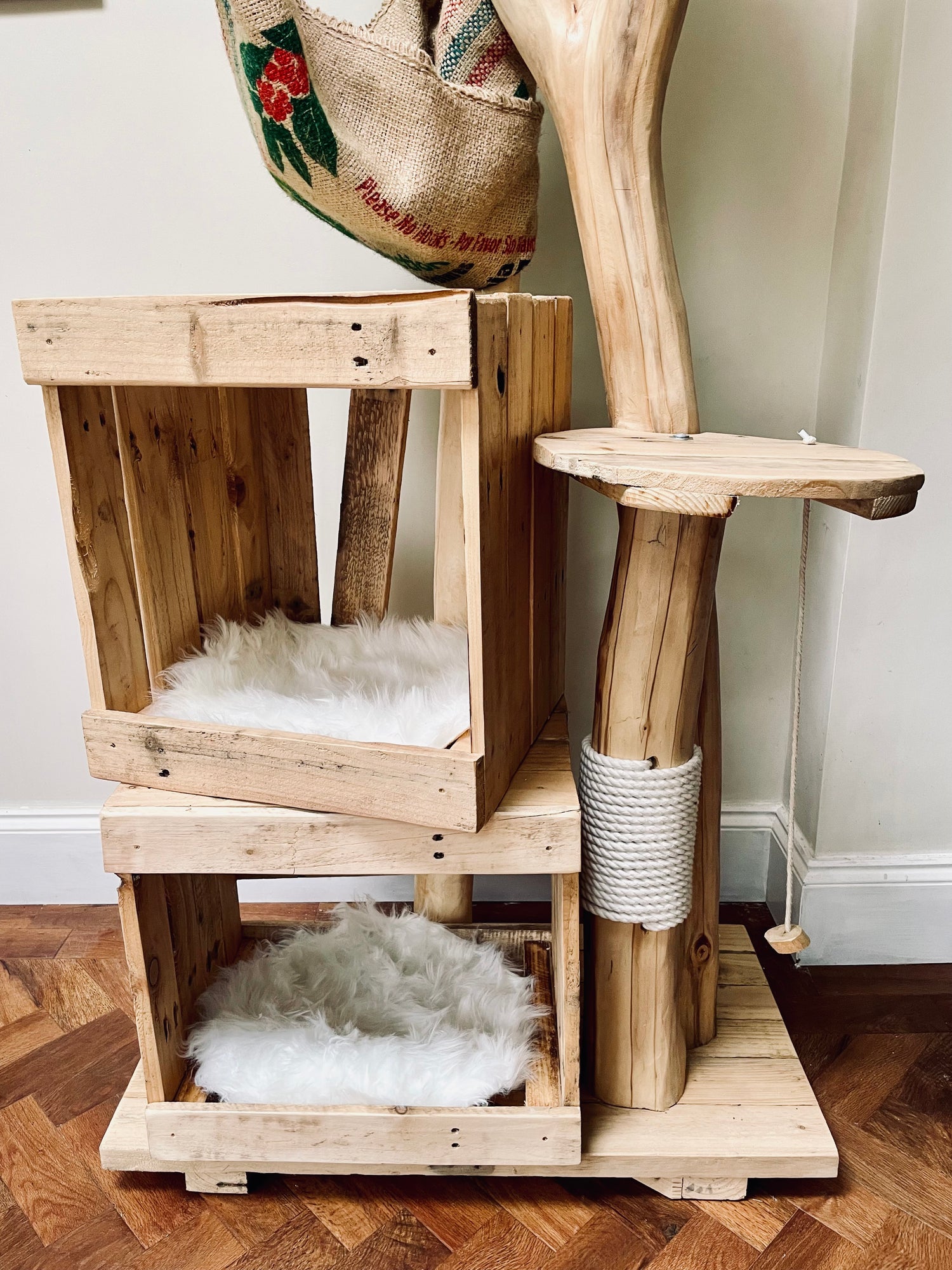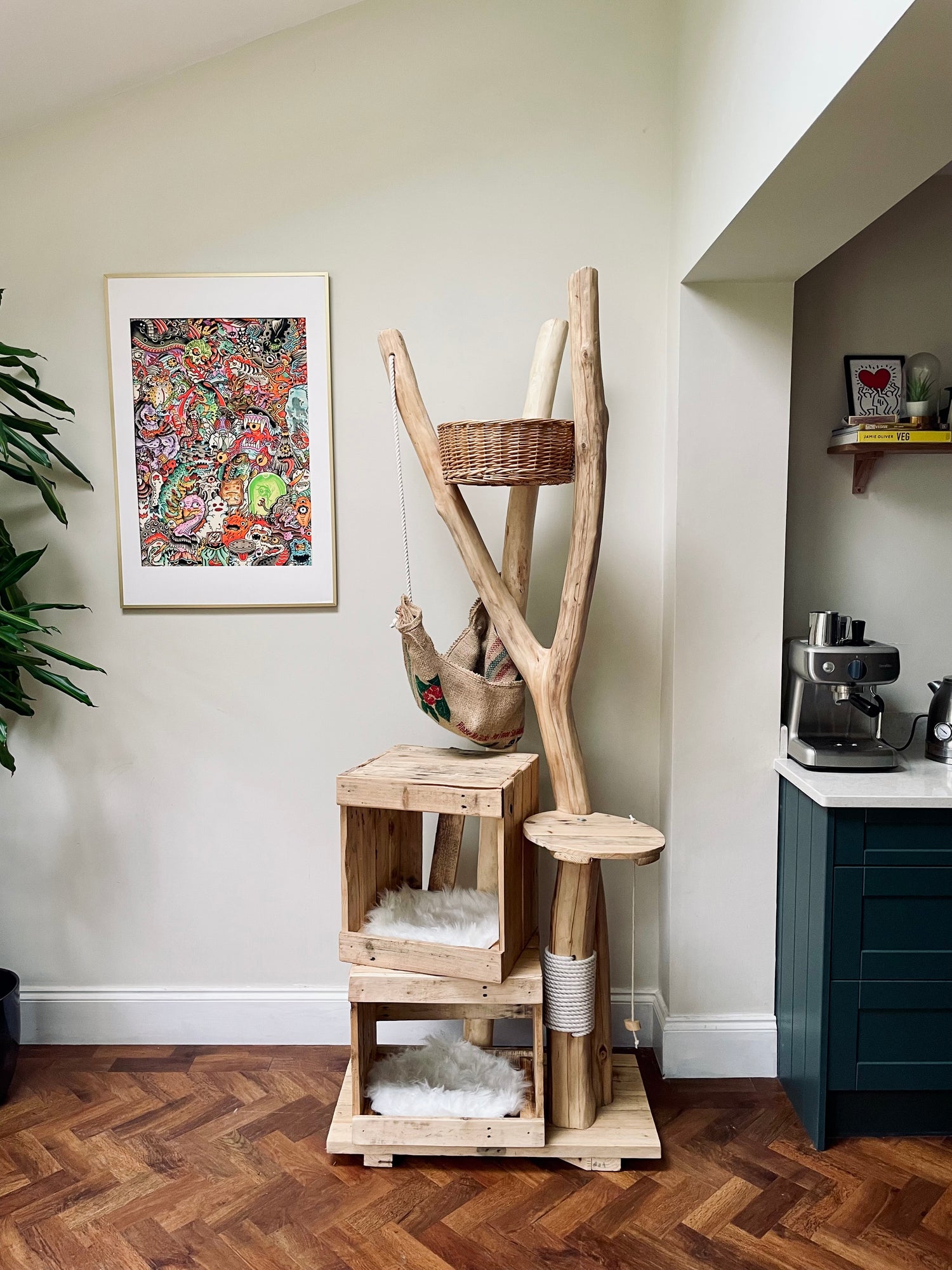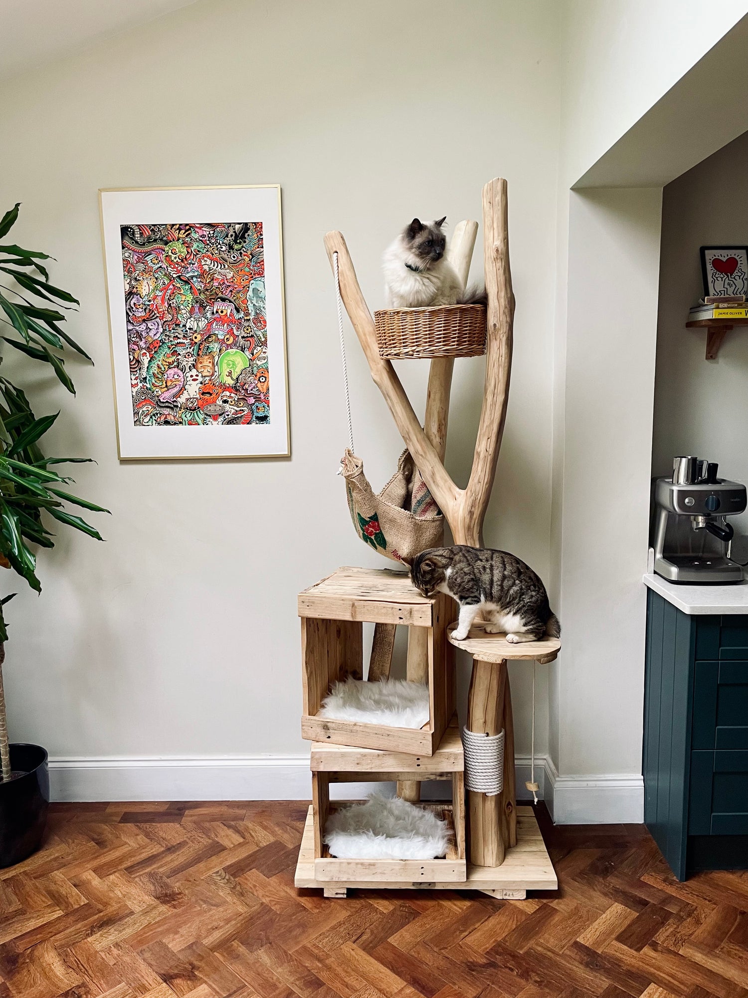 This handcrafted solid wood cat tree captures the spirit of the outdoors, turning your home into a wild playground where your feline can climb, perch and rest in total comfort.