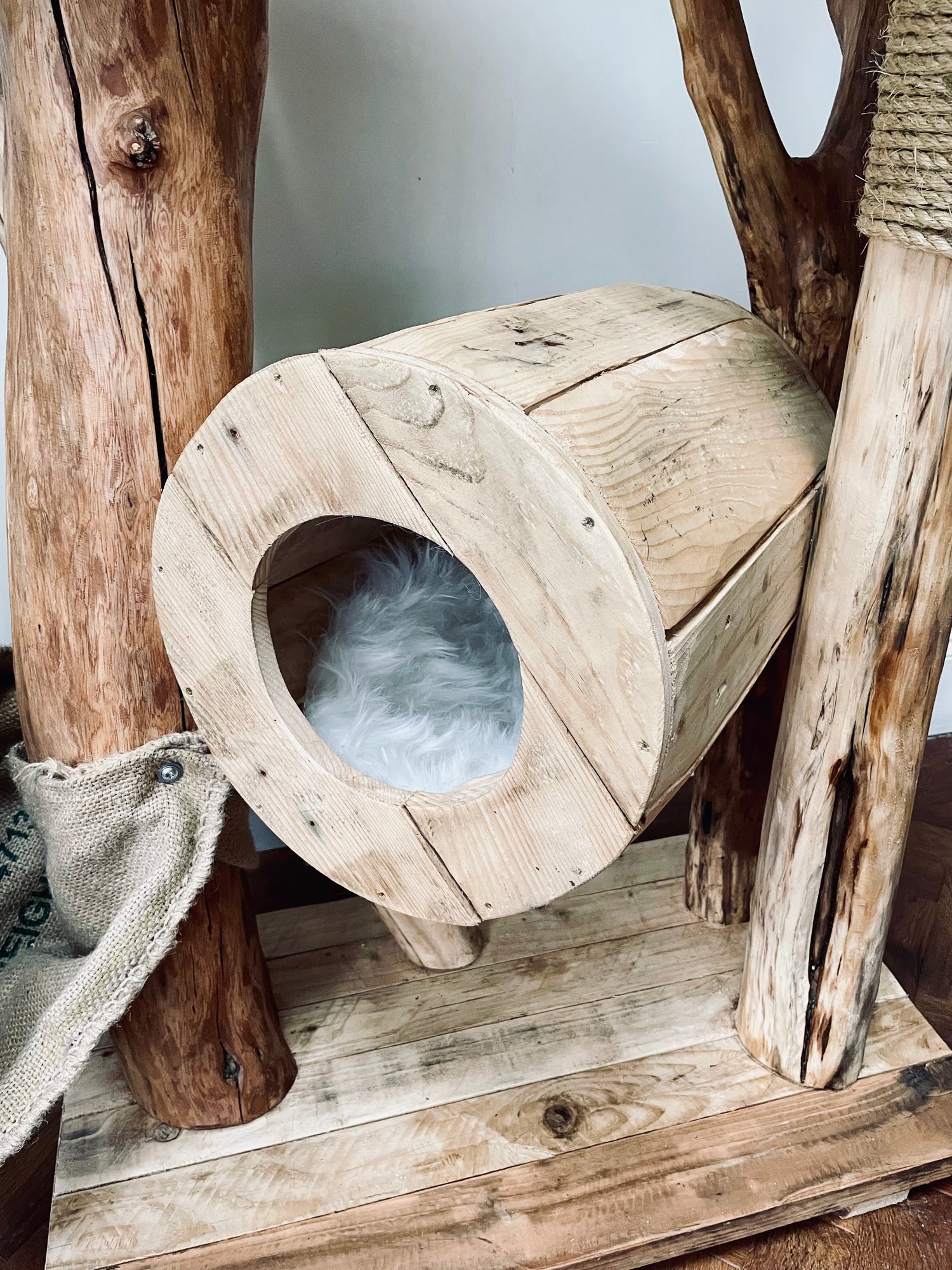 🛏️ Ultimate Comfort – Includes a soft cushioned wicker basket, barrel, hammock and wooden platform for naps.