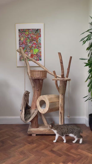 This handcrafted solid wood cat tree captures the spirit of the outdoors, turning your home into a wild playground where your feline can climb, perch and rest in total comfort.
